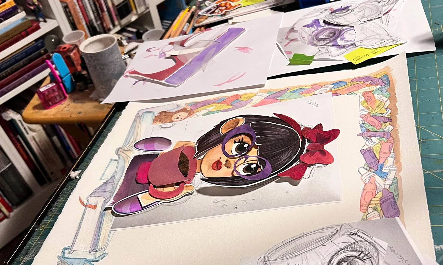 come see in person the original paintings and collage work that is felix, dracula 3x, sadie’s audition, and more! (p.s. reproductions never do “real” art justice, ammiright??)